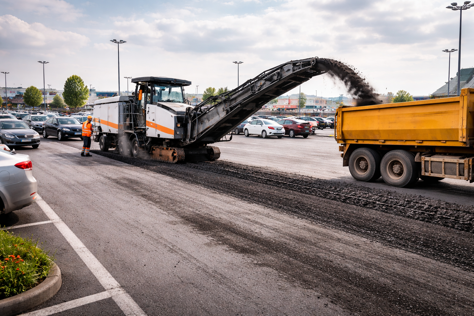 Fraisage d’un parking poids lourds soumis à de fortes contraintes mécaniques. Intervention ciblée pour améliorer l’adhérence, sécuriser les manœuvres et prolonger la durée de vie de la chaussée.