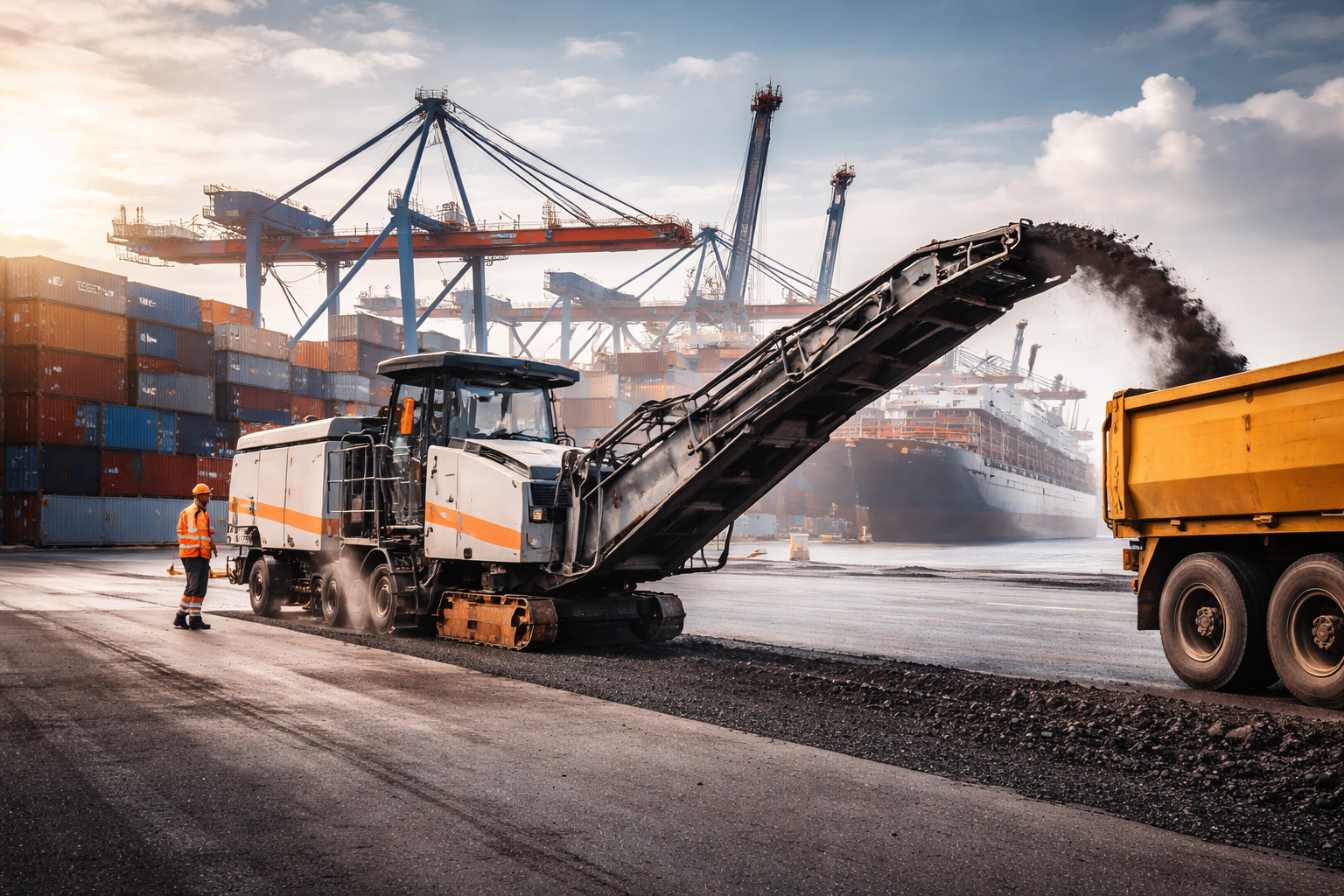 Rabotage des voies internes d’un site industriel en exploitation. Travail de précision pour corriger les déformations, gérer les pentes et préparer les chaussées à une réfection durable sans interrompre l’activité du site.